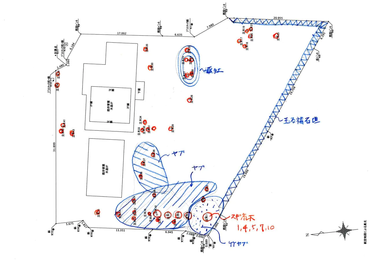 ところで、 計画を進めるためには屋敷林に生えている木々の見取り図を作る必要がありました。そこでプロの指導を仰ぐことにして、前川建築グループで造園チーム(niwanoso)を率いる堀さんに調べてもらったのが下の調査図です。