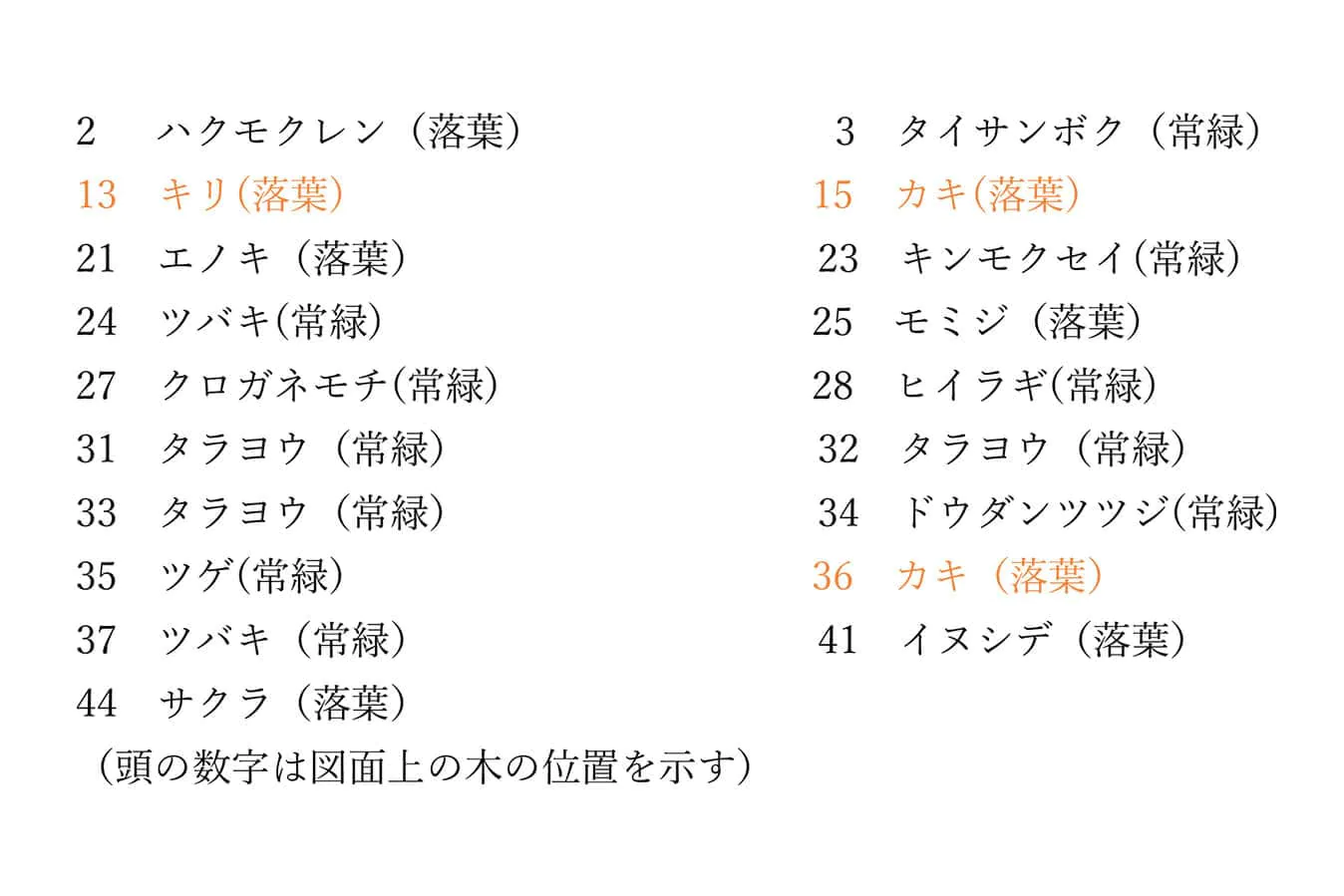 杉を伐り、藪を開き、密に絡んだ⽊⽴を間引いた結果、現れたのは予想外に多種類の⽊々です。樹種は全部で16種、うち落葉樹が8本、常緑樹が11本で合計19本。以下がそのリストです。(⾚字のカキはその後クマの害を防ぐため、キリは腐⾷のために伐採しました。)